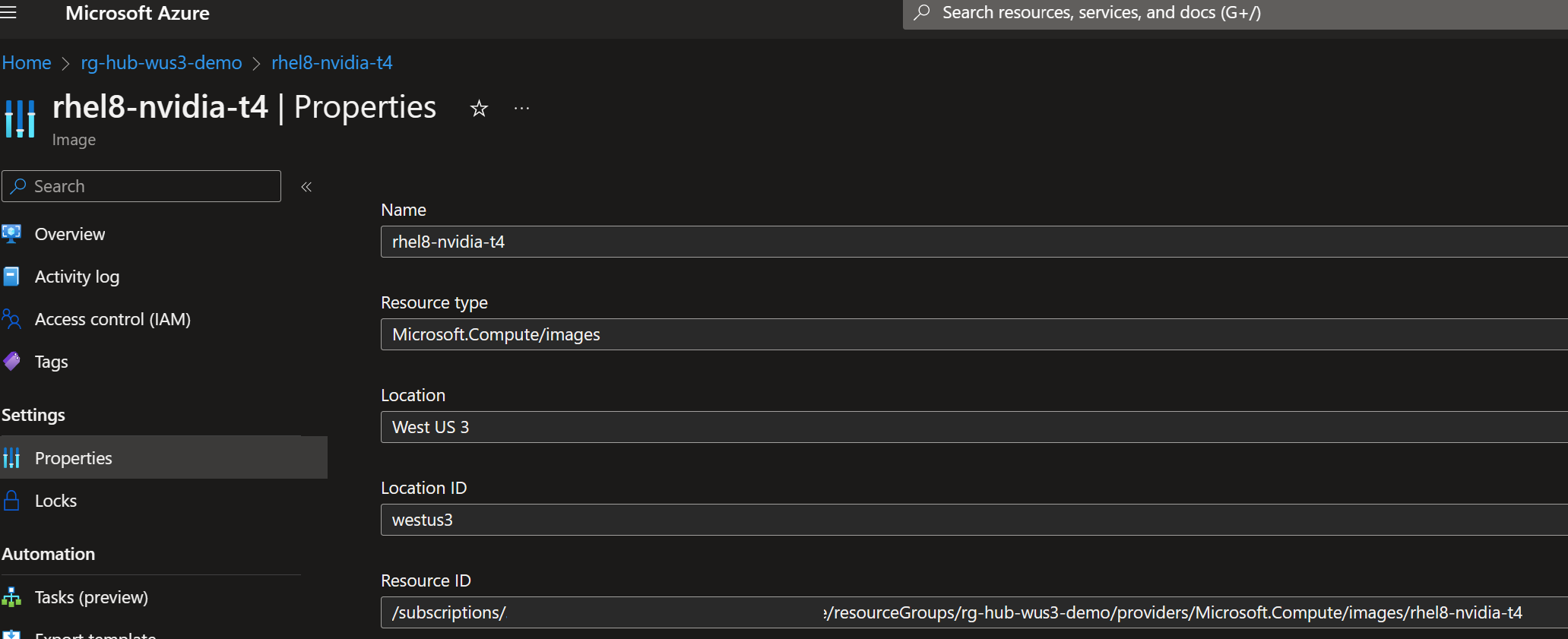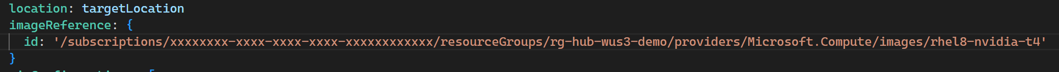 ManagedImageId: /subscriptions/xxxxxxxx-xxxx-xxxx-xxxx-xxxxxxxxxxxx/resourceGroups/rg-hub-wus3-demo/providers/Microsoft.Compute/images/rhel8-nvidia-t4