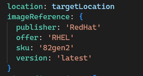 The ManagedImageId can be used to reference the image when deploying a VM using Bicep, ARM or Azure CLI. I usually deploy with bicep templates so I just need to update the image reference property on the VM. All that's needed is to find the platform image reference in the template, which looks something like this: